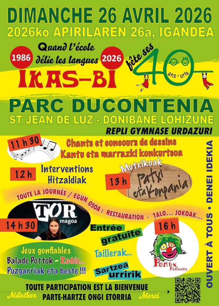 L’association IKAS-BI organise le 26 avril 2026 à Saint-Jean-de-Luz (Parc Ducontenia) une grande journée festive pour célébrer les 40 ans de l'enseignement bilingue à l'école publique.